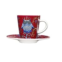 I also own a 13oz mug and love the whimsical design. From the images shown here, I originally thought that the this was a miniature version of the mug (which would have been super cute!), but it is not. Unlike the much larger mug (as in the picture on the lefthand side (w/o saucer)) which shows two different owls and a fox, the espresso cup only shows one owl.